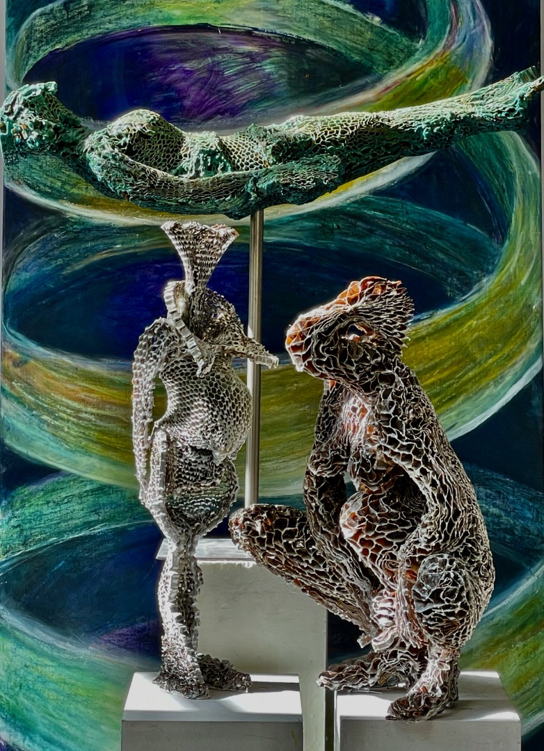 open structuren en monumentale vormen. Mijn voorkeur gaat uit naar architectonische sculpturen waar mensen in kunnen vertoeven. Bij kleinere plastieken is het nieuw voor mij om schilderijen en beelden te presenteren als een kunstwerk.